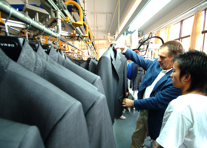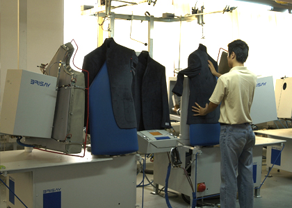 運用高品質的德國BRISAY立模整燙機,采用電腦控制蒸汽輸出量、溫度、壓力、定型、抽濕時間,根據面料的厚薄、質地、性能,以38種不同整燙程序調整以上各個參數(shù),配合服裝的整燙。